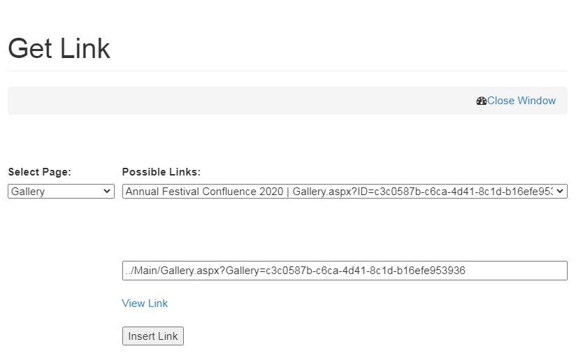 • Click on Get Local link, select Gallery or Gallery List from the select Page drop down menu and click on Insert Link.